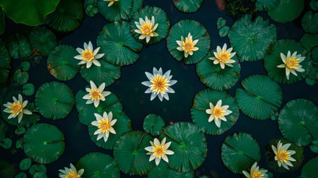 A stunning aerial view of blooming water lilies surrounded by lush green leaves on a serene pond. This composition captures the beauty of nature and tranquility.