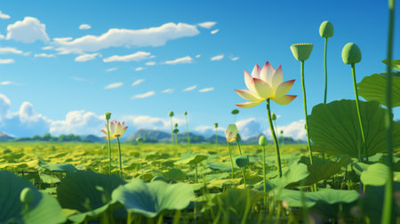 a lotus flower blooms in a vibrant green patch of grass, surrounded by a realistic blue sky in the style of northern china's terrain. this hyper-detailed rendering showcases the beauty of the flower against a backdrop of multicolored landscapes. the combination of realistic and cartoonish features creates a visually stunning image, created using maya and cryengine. ai generated