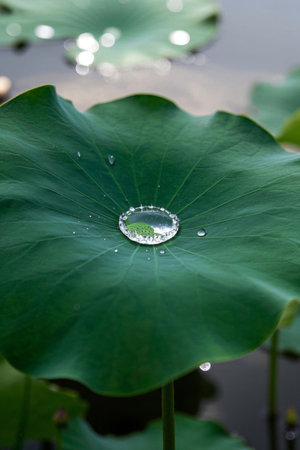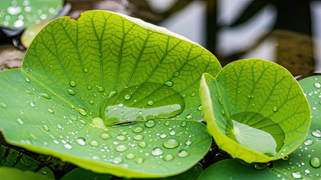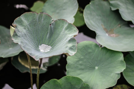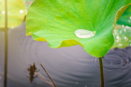 Lotus leaf with water droplets on the surface of the water.