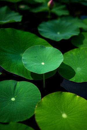 lotus leaves in the pond. Peaceful and calm concept. Composition of Green lotus leaves. Natural Lush Foliage of Leaves Texture Backgrounds.