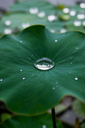 Water drops on lotus leaf, natural green background, selective focus