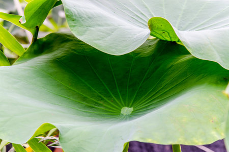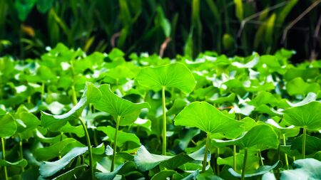 Close up of the green lotus leaves in the pond during the sunny day.
