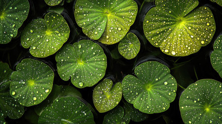 Natural water droplets on green leaves set against a dark theme, capturing the essence of freshness and tranquility in nature photography