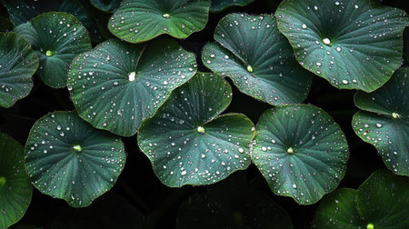 Water droplets on dark green leaves against a moody background, perfect for nature photography with a touch of elegance and tranquility