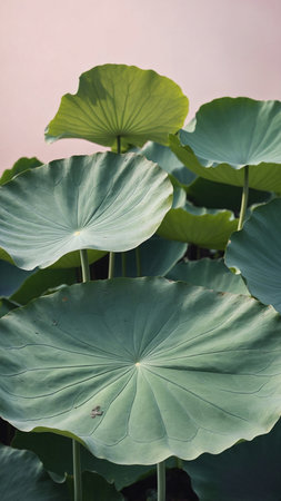 A tranquil scene with large, round green lotus leaves against a gentle pink backdrop, embodying calmness and nature’s simplicity