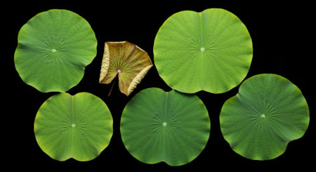 Five bright green lotus leaves and one dried, brown lotus leaf are showcased individually on a transparent background.