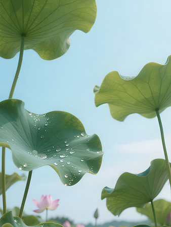 Green lotus leaves with raindrops in a tranquil pond. Generative AI