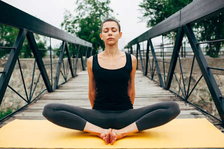 young slim woman doing yoga in the park on the wooden bridge, sitting on the floor