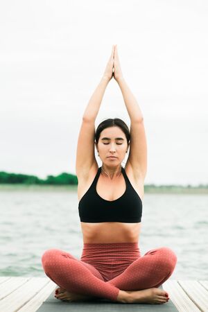 Young beautiful girl with long brown hair in a sports top and tights sits in lotus position on the wooden pier near the water on the summer day