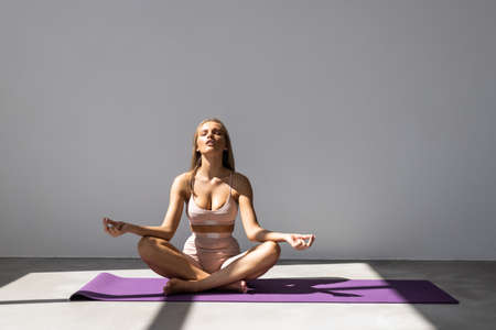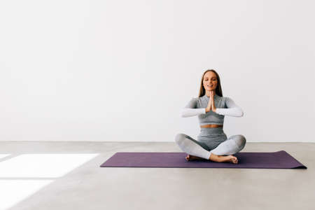 Young sporty attractive woman practicing yoga, meditating in yoga pose, working out, wearing sportswear, indoor full length, light yoga Studio