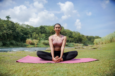 Mental and physical health. A slender, tanned Asian woman in sportswear practices yoga by a tranquil river in the morning. The woman is in the Sukhasana pose, a meditation pose.