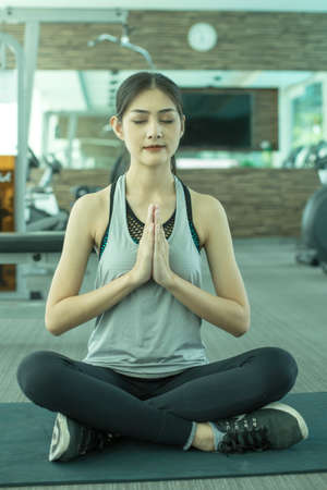 Woman Doing Yoga Exercises In Gym, Sport Fitness Girl Sitting Lotus Pose Meditation Relaxation