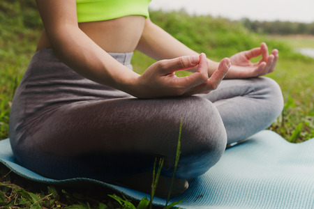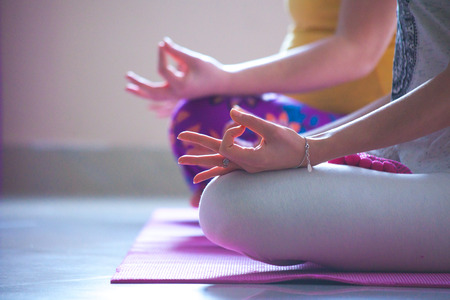 closeup of women hands in mudra gesture practice yoga indoor sit in lotus position