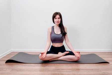 Cropped image of young woman sitting in lotus position on a mat.