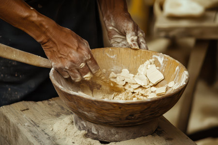 Hands mix clay pieces in a wooden bowl at a pottery workshop in a rustic setting surrounded by tools and materials during daylight hours.
