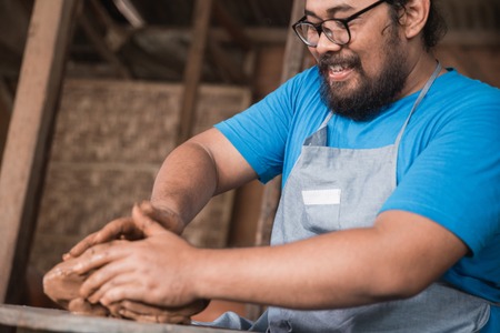 Adult male potter master preparing the clay on table. Front view, closeup, hands only. Art and business, hobby and freelance working concept.