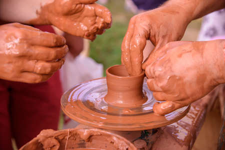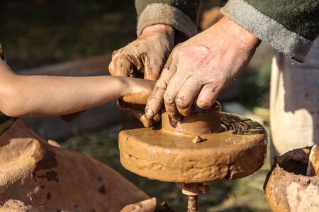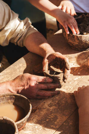 Hands of a boy and a man sculpt clay dishes. The ancient method of making dishes.