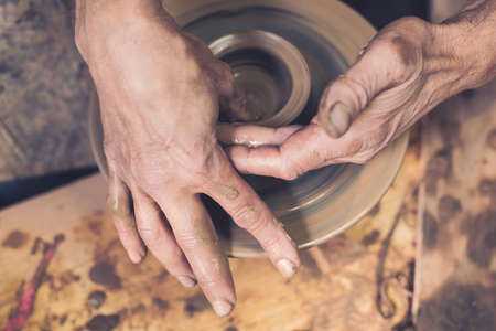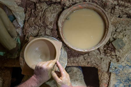 Hands of the potter. The potter makes pottery dishes on potter's wheel. The sculptor in workshop makes clay product closeup