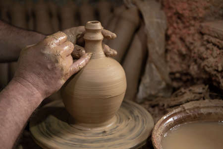 Male potter makes a pot on the pottery wheel. Terracotta pottery guy on spinning wheel. Men making ideas about pottery with a center of land