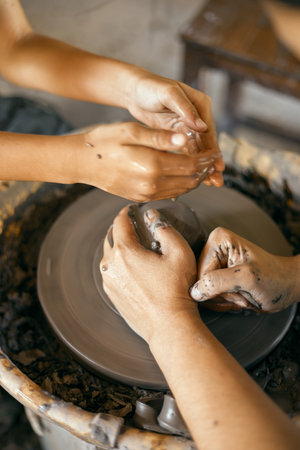 The potter teaches the child how to form a clay jug on a potter's wheel.