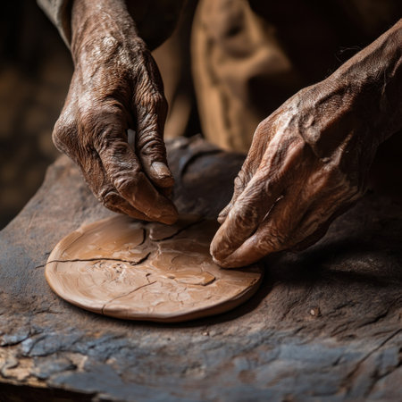 A skilled artisan carefully molds a piece of clay into a circular plate, showcasing intricate craftsmanship in a rustic workshop lit by soft, natural light.
