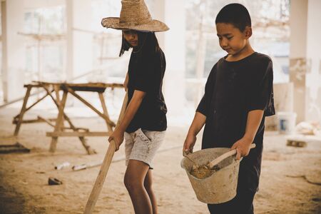 Little boys and girls labor working in commercial building structure, World Day Against Child Labour concept.