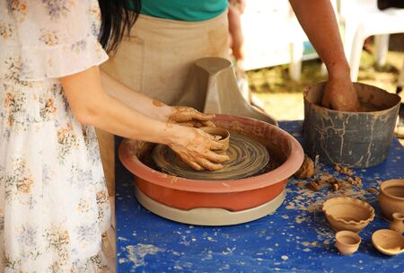 The delicate hands of a potter woman sculpt clay dishes on a potters wheel. Folk craft for making dishes. Creation of a ceramic product. Teaching ancient craft. Utensils for everyday life. History
