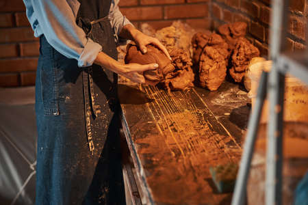 Unrecognized ceramicist in apron working with fresh wet clay i pottery workshop