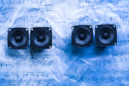 Car audio system. A set of speakers on a blue background. Copy space