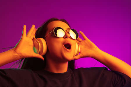 Music. Beautiful young emotional girl, student with long dark hair isolated on gradient pink-blue background in neon light. Concept of emotions, youth