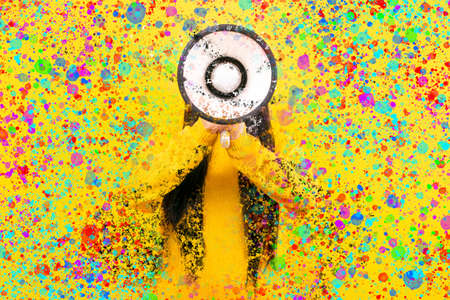 girl in a yellow sweater with a megaphone, creative colorful splashes on the image, concept of extraordinary advertising