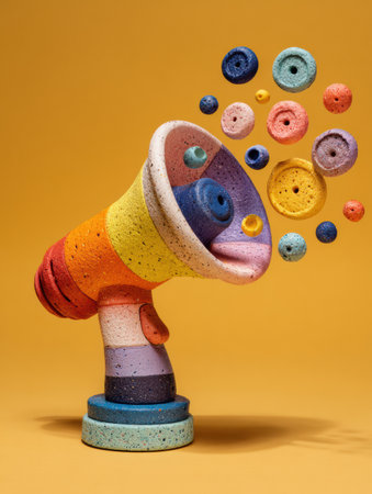 A clay megaphone in multiple colors releases various brand messages through lively bubbles, showcasing creativity against a solid yellow background.