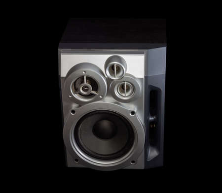 Home high fidelity three-way loudspeaker system with bass reflex port in silvery housing on a dark background