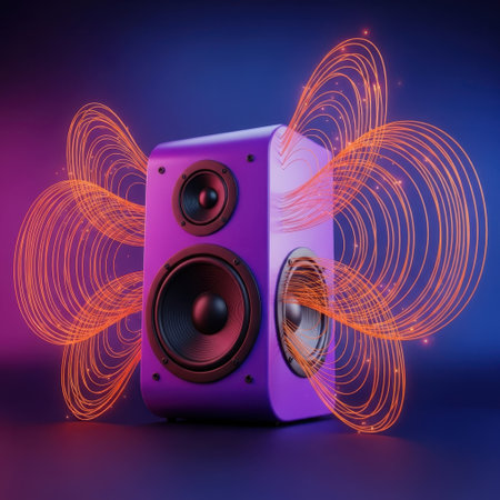 A striking image featuring a purple speaker with multiple drivers, emanating abstract, swirling orange sound waves. The dynamic composition, set against a gradient blue and purple background, evokes the power and energy of music and audio technology.