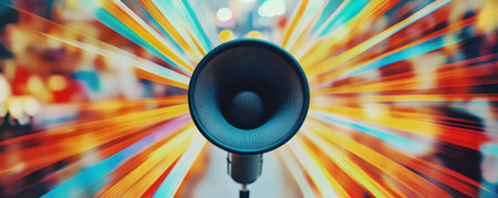A close-up view presents a speaker emitting a vibrant display of multicolored light rays. The composition features a central speaker element, surrounded by an explosion of radiating hues. The image likely symbolizes sound, music, and energy. Suitable for designs related to audio, entertainment, or technology.
