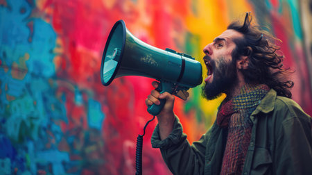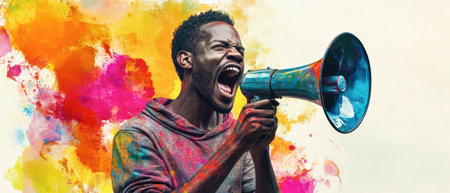 A dark-skinned man passionately shouts into a megaphone, surrounded by bright watercolor splashes that enhance his vibrant expression of energy and urgency.