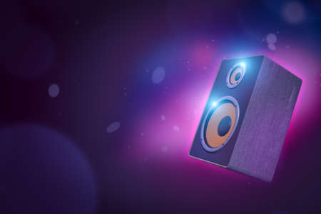 Sound audio speaker with neon lights on dark background. Dynamic monitor closeup. Creative backgroound