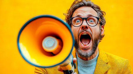 Excited young man shouting into a yellow megaphone with energy and expression against a vivid wall.