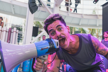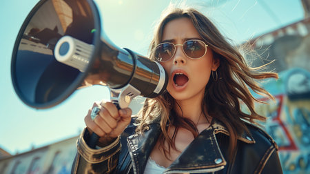 Young activist in a protest, shouting in a megaphone. Demonstration