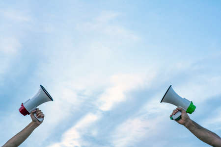A protestor at a political demonstration talking into a loudpeaker megaphone