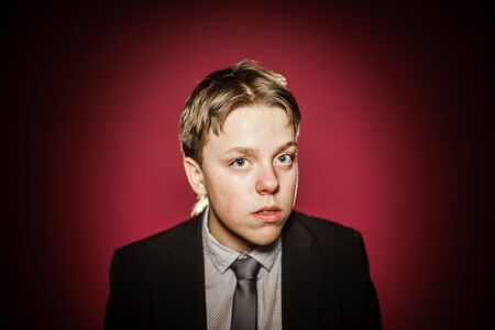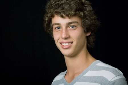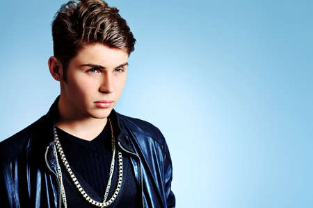 Portrait of a handsome teenage boy over gray background. Studio shot. Teen fashion.