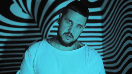Crazy man in a straitjacket in a psychedelic room looks at you