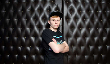 Portrait of a young man wearing a black T-shirt. A man in a black classic sweater on a black background. The dark-haired young man. An enigmatic look.