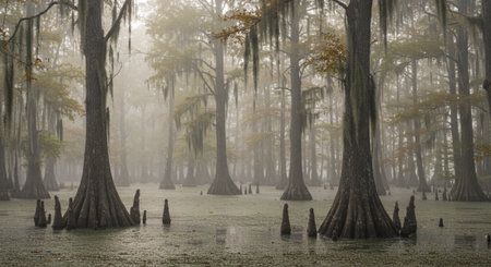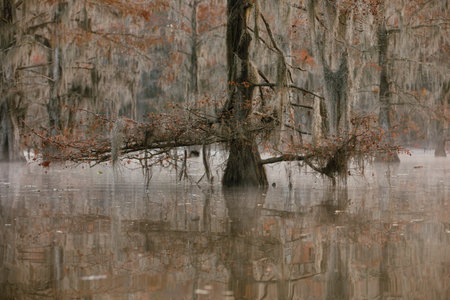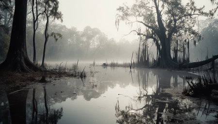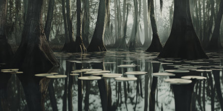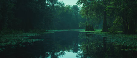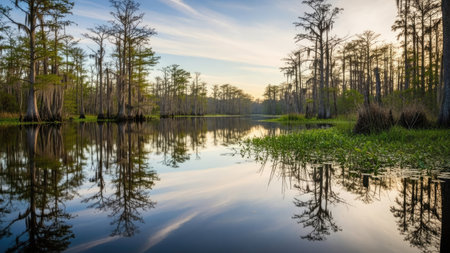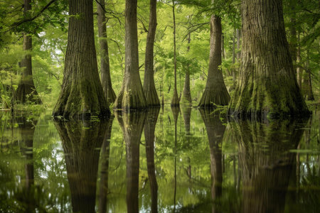Mysterious reflections in a cypress swamp with still water surrounded by trees