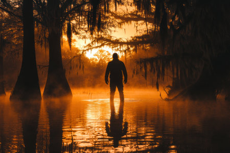 Silhouette of a mysterious man standing in a swamp at sunrise with a misty morning and tree.