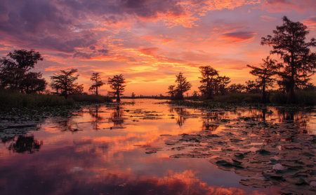 A scenic view captures a sunset over still water, reflecting the colors of the sky and silhouettes of trees. The composition includes a rich palette of orange, purple, and yellow hues. The image showcases a natural environment. Suitable for a variety of commercial and editorial applications.
