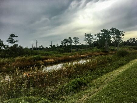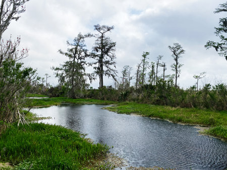 A beautiful shot of a gloomy day on the Cypress swamps with hanging tree branches in the USA