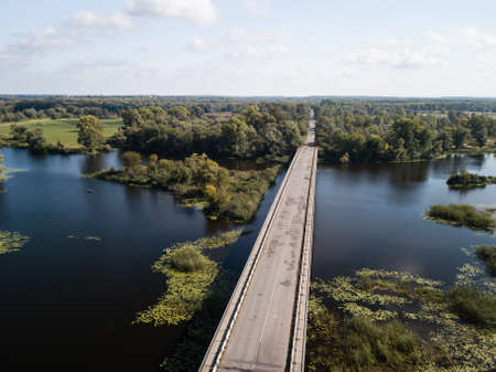 Aerial to auto road bridge over Desna river in Chernihiv region at summer, Ukraine