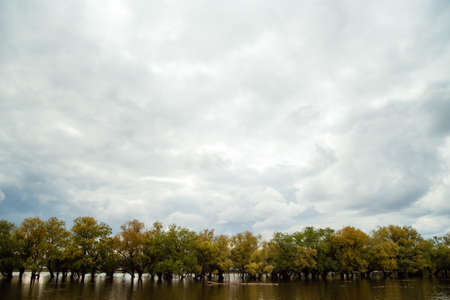 A river that overflowed its banks.Spring flood.Spring landscape.The river overflowed its banks,trees stand in water.