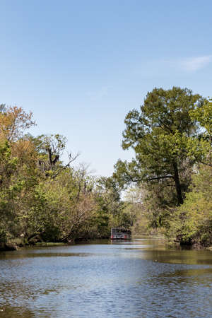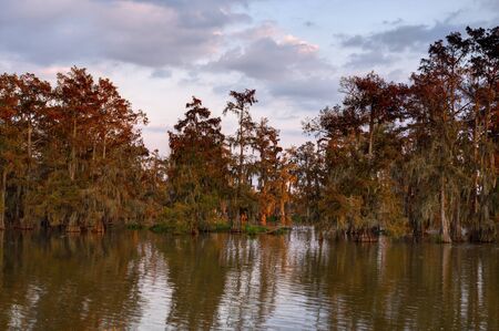 Magnificent reflections in the mirror water. Sunset. New Orleans area. Swamps of Louisiana. Journey to America. Boat excursion to the protected areas of the Mississippi Basin.